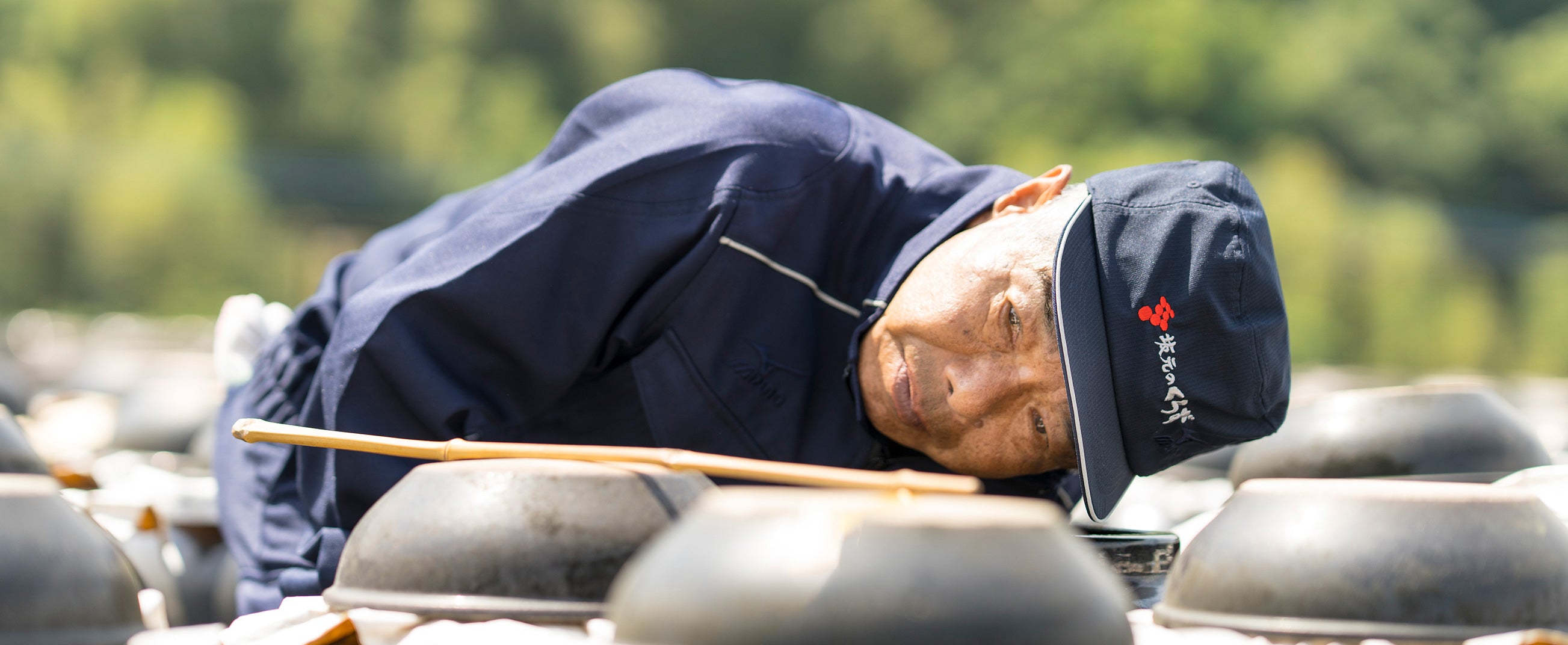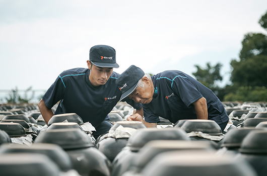 1壺1壺黒酢の顔色を五感で確認し、愛情をもって成長を促す手助けをすることは醸造技師にしかできない役割です。私たちは「醸造技師制度」という独自の社内制度を制定し、醸造技師の育成と技術継承に世代を越えて取組んでおります。