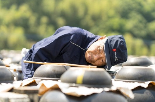 醸造技師たちは毎日、1壺1壺黒酢の顔色を五感で確認し、自分の子どもを育てるように、愛情をもって成長を促す手助けをしています。